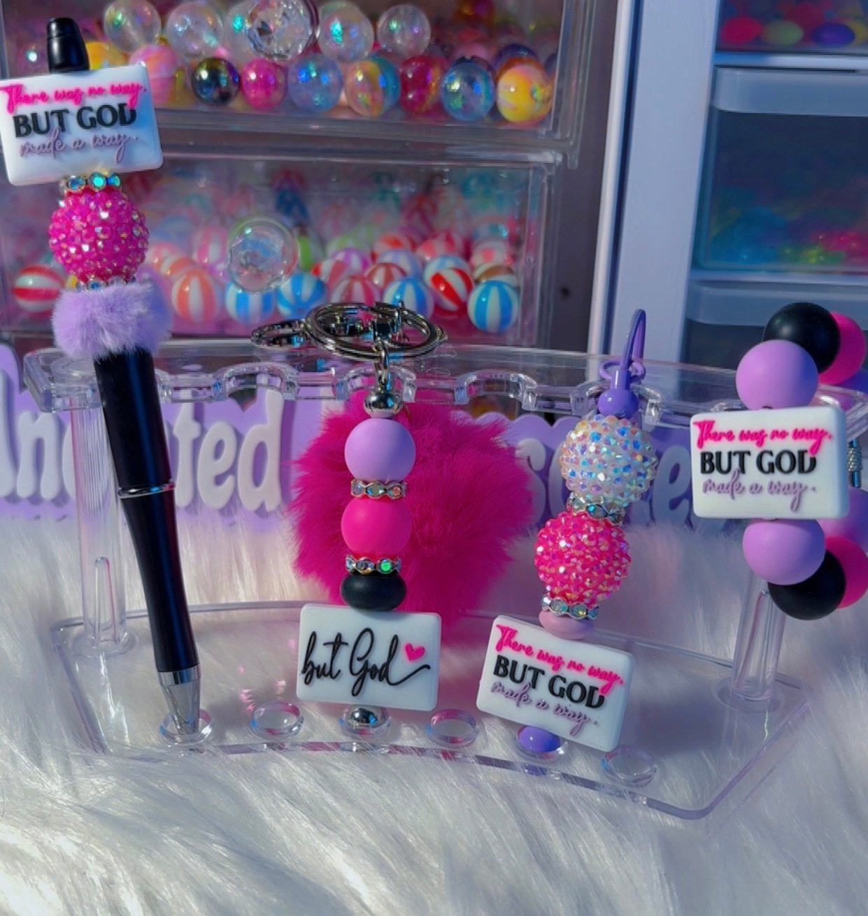 This set features a handmade pen, keychain, bookmark, and cup charm.